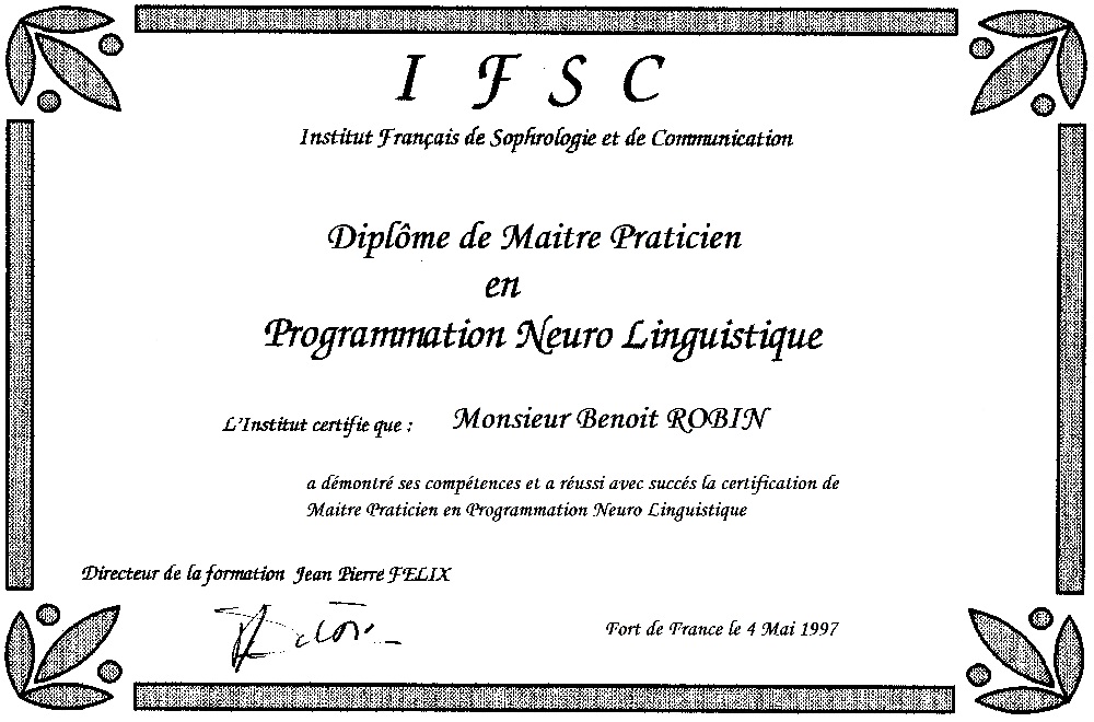 J’ai commencé ma formation en 1992 en Amérique Centrale et j’obtiens mon diplôme de Master en Programmation Neurolinguistique en 1997, (PNL : technique de psychologie Américaine), avec 5 formateurs dont 4 de renommée internationale.